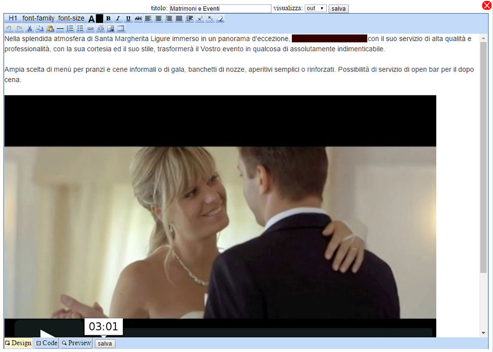 MakeWeb Hotel CMS consente la gestione dei contenuti della pagina in modalità design, code e visuale per l'editing professinale di contenuti testuali, visuali, multimediali ed il caricamento di allegati nei principali formati standard.